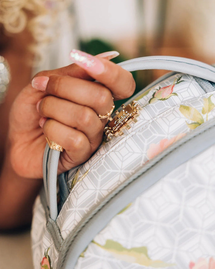 Dimensions: 27 cm x 45 cm x 15 cm Matériaux: 100% polyvinyl chloride Poche avant avec fermeture éclair Poches latérales Poche de rangement pour charnières Compartiment séparé pour lunettes de soleil en velours Bracelets réglables pour un ajustement personnalisé Charnières dorées avec matériel métallique Insigne en métal La manche arrière coulissante se connecte...