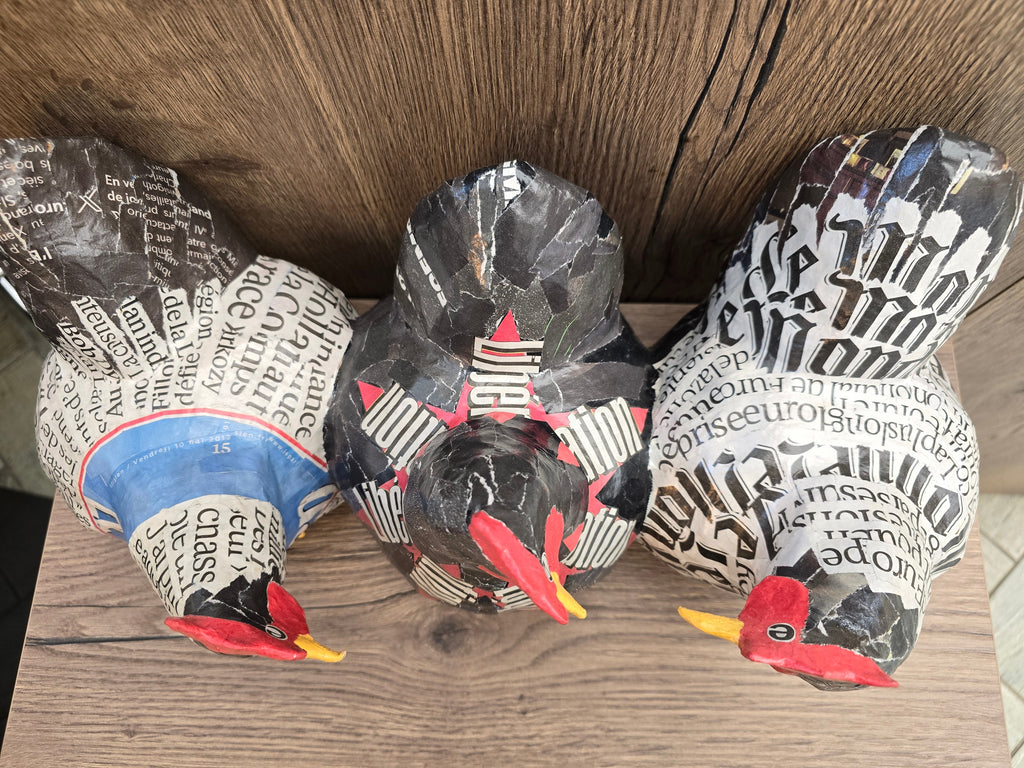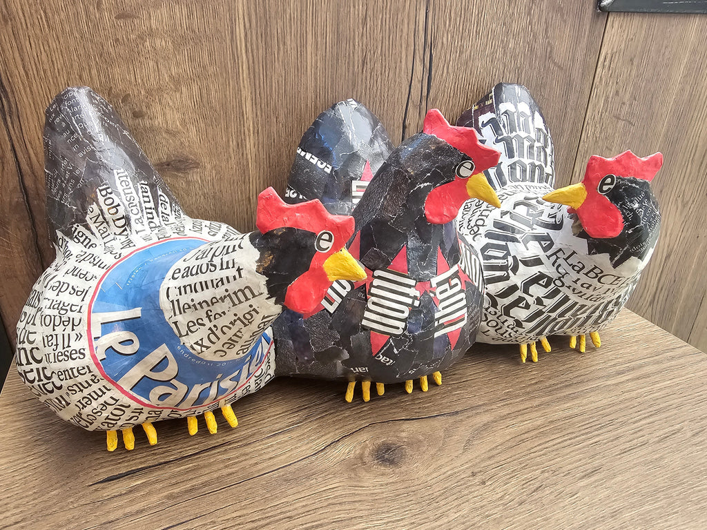 3 poules en papier mâché-Aude Goalec et Nicole Jacobs