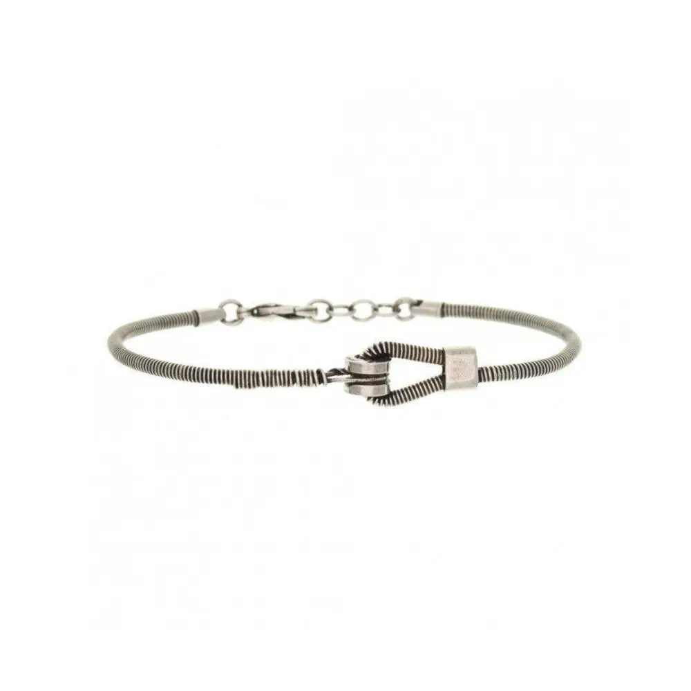 Bracelet horizontale en corde de basse argentée vieillie. Le bracelet s'attache grâce à un fermoir mousqueton, une chaîne de rallonge permet de l'adapter à tous les poignets. Fabrication dans les ateliers de Marseille.