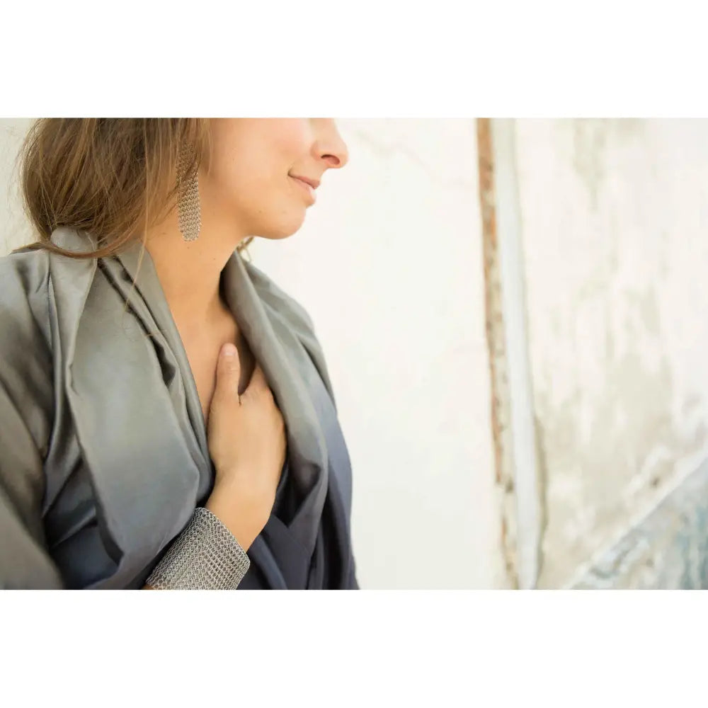 L'esprit basique, c'est toute la force et la sensualité de la matière. Comme une caresse, la manchette en est l'expression même. Proposé en 6 tailles. Extrêmement résistant, il se porte au quotidien et se mélangent aux autres sautoirs, bracelets et colliers en cotte de maille de la marque.