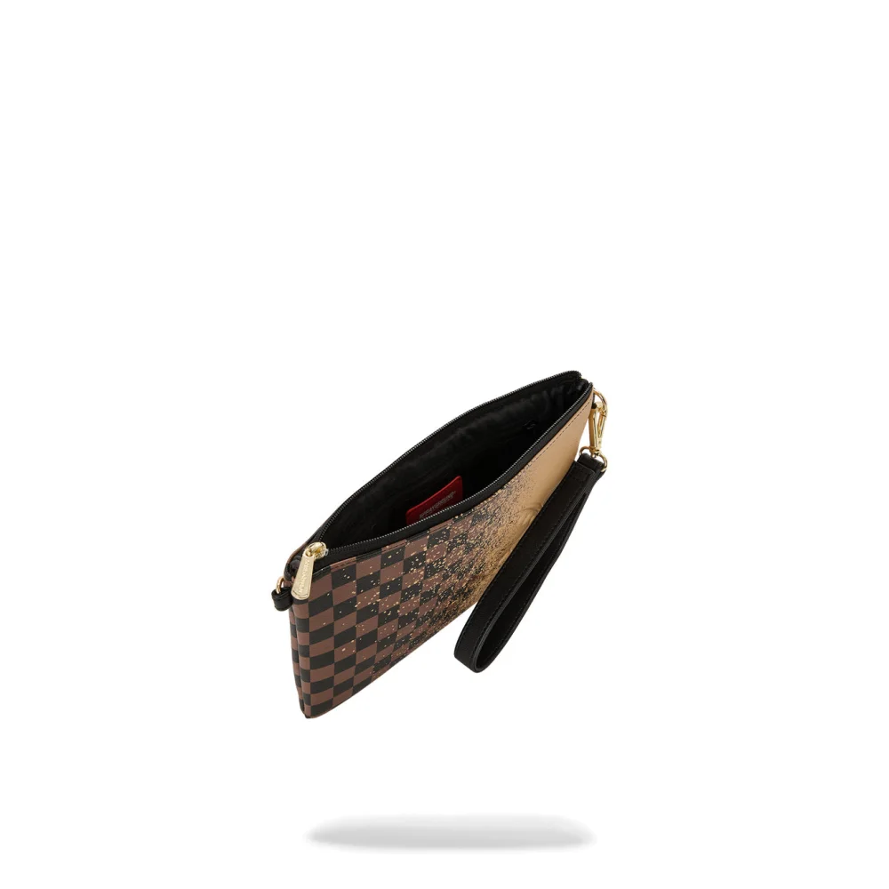 Pouchette avec bracelet amovible, poignée sur le panneau avant, fermeture zippée, poche secrète cachée sur la couture latérale.